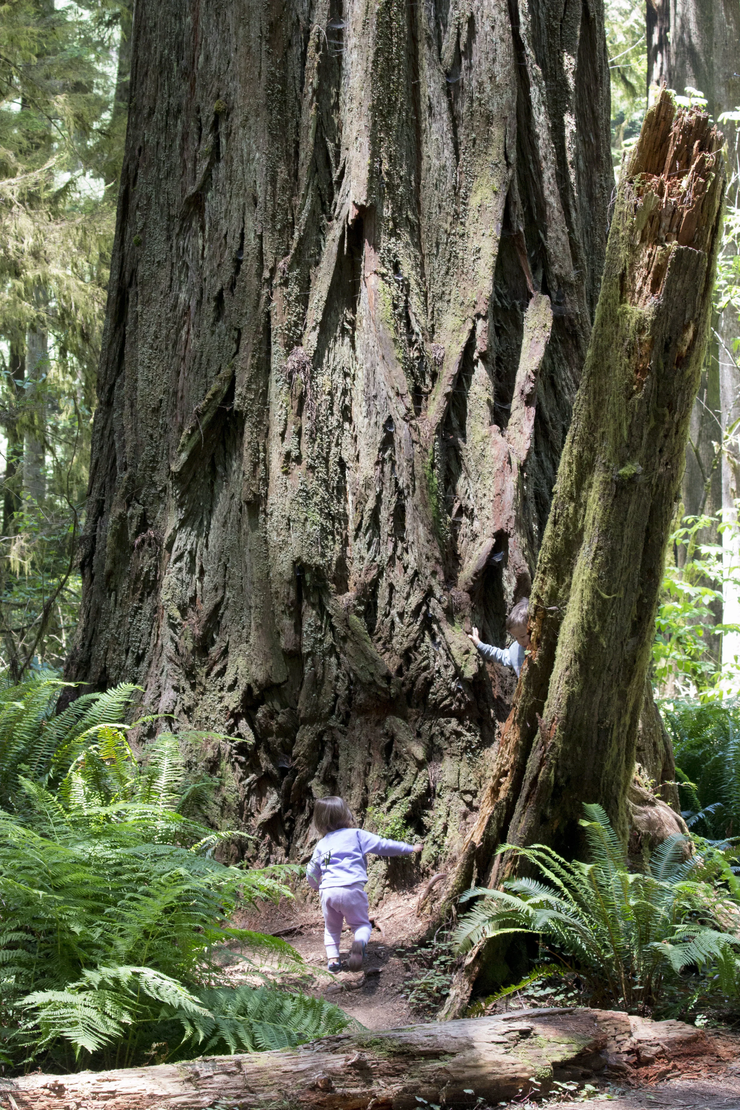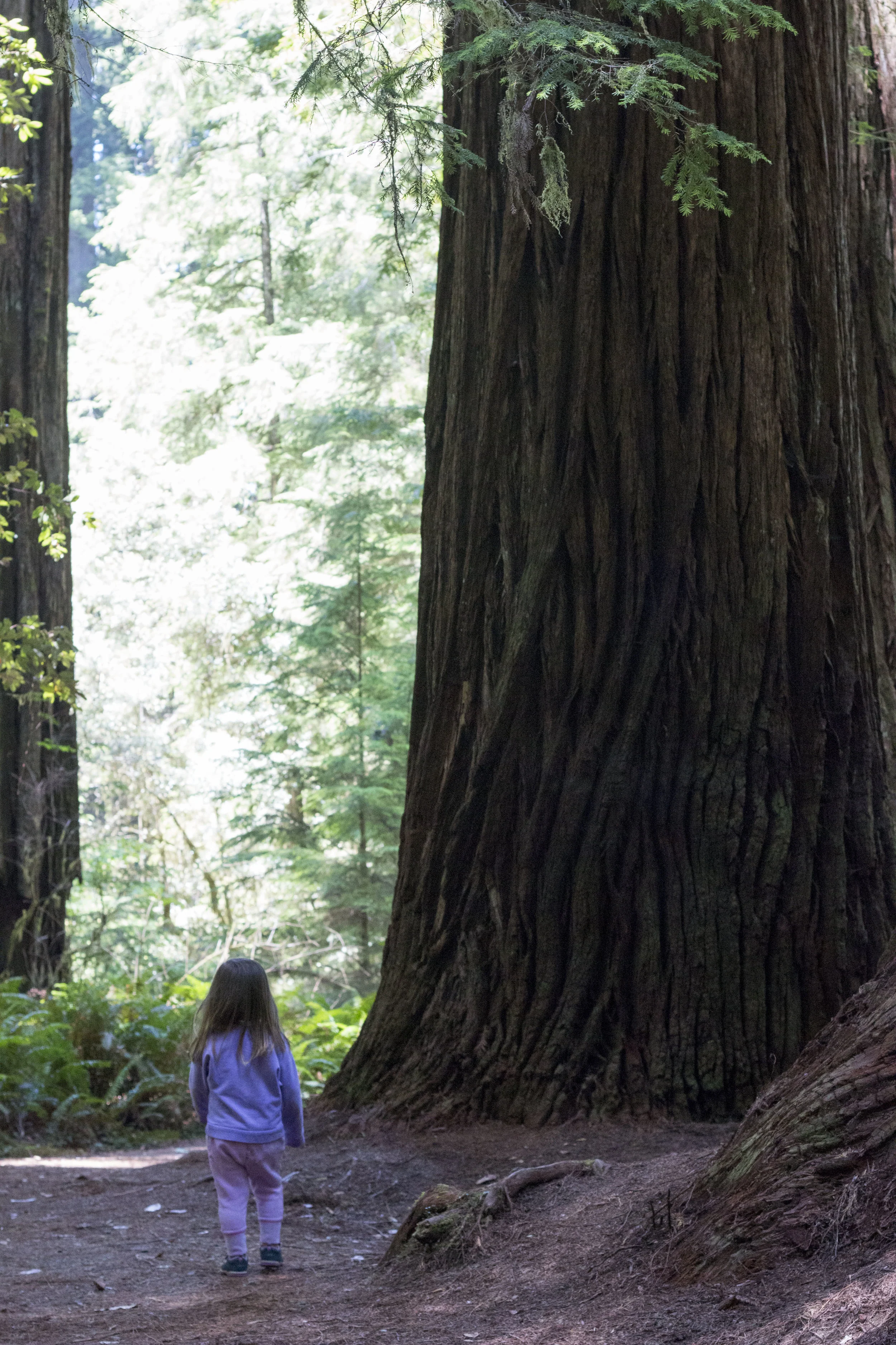 Our little giant in a true giant at Jedediah Smith State Park along California's Smith River.