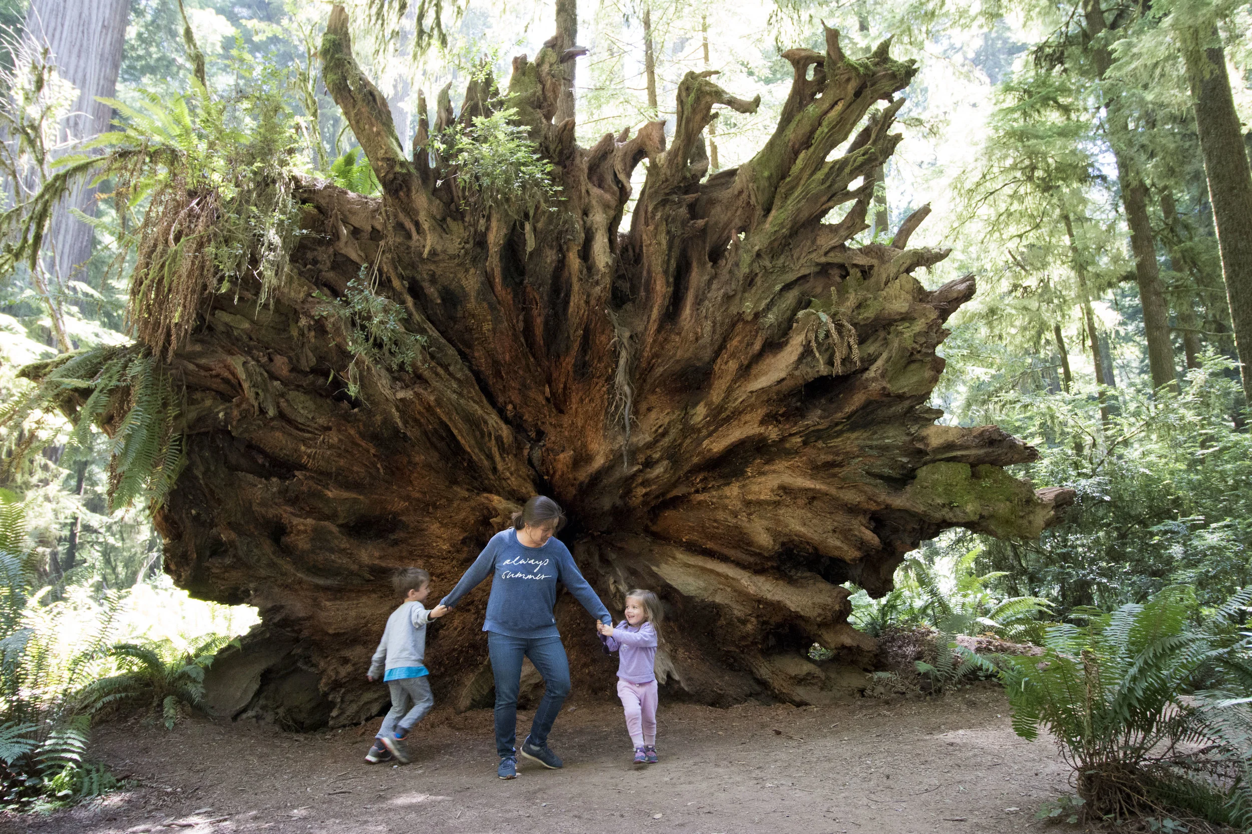 An enormous uprooted trunk along the Simpson Reed Trail in Jedediah Smith State Park.