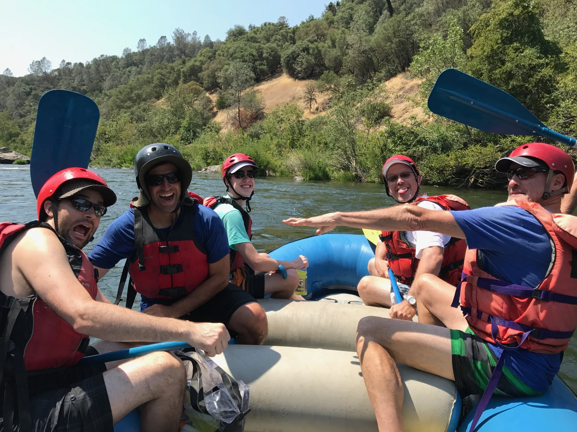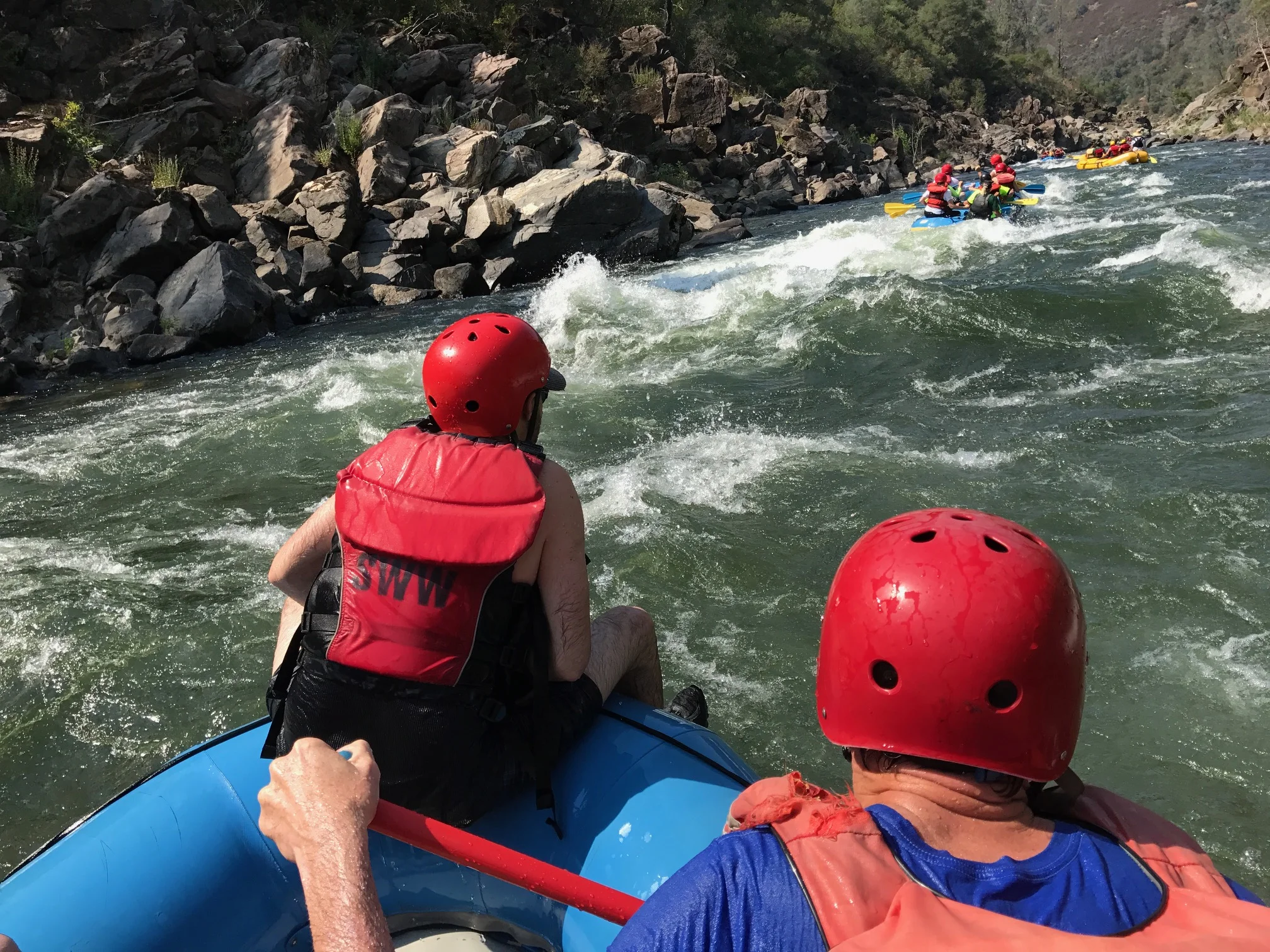 There are over 25 commercial outfits that operate on the South Fork of the American River. We were well taken care of by Sierra Whitewater operating out of Auburn. The river is divided into two sections both class III+, the upper Chili Bar run that is typically run in the mornings and the lower Gorge section that flows into Folsom Lake. Mr. "duct tape" is bottom left.